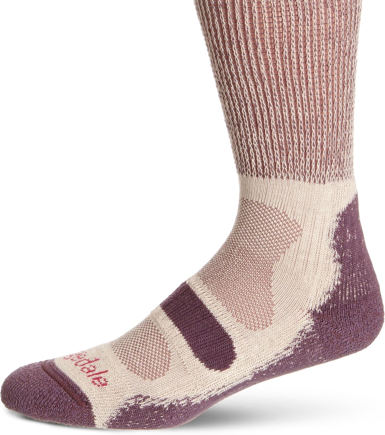 Bridgedale, Coolfusion lightweight women's socks with underfoot pads for hiking and other outdoor activities in warm climates. Cotton and Coolmax for comfort. Covers each foot with breathable comfort. The COOLMAX combined with cotton sits gently against the skin and reduces the risk of rubbing and discomfort, because we know how much blisters can ruin the day. The 4-channel construction wicks moisture away from the skin through rapid evaporation, keeping you moisture free and comfortable during hot days and when you need to cover longer distances. The T2 padding has been knitted into key pressure points, on the sole of the foot and heel to provide exceptional impact protection. The ring inside a ring provides elastic cushioning, relieving joints while hitting hard, merciless ground. An elastic arch and hem create a firm, non-slip fit, so you can enjoy a smooth and comfortable surface. Size Guide: S: UK 3-4.5, EU 35-37, US 4-6.5, M: UK 5-6.5, EU 38-40, US 6.5-8, L: UK 7-8.5, EU 41-43, US 8.5-10.