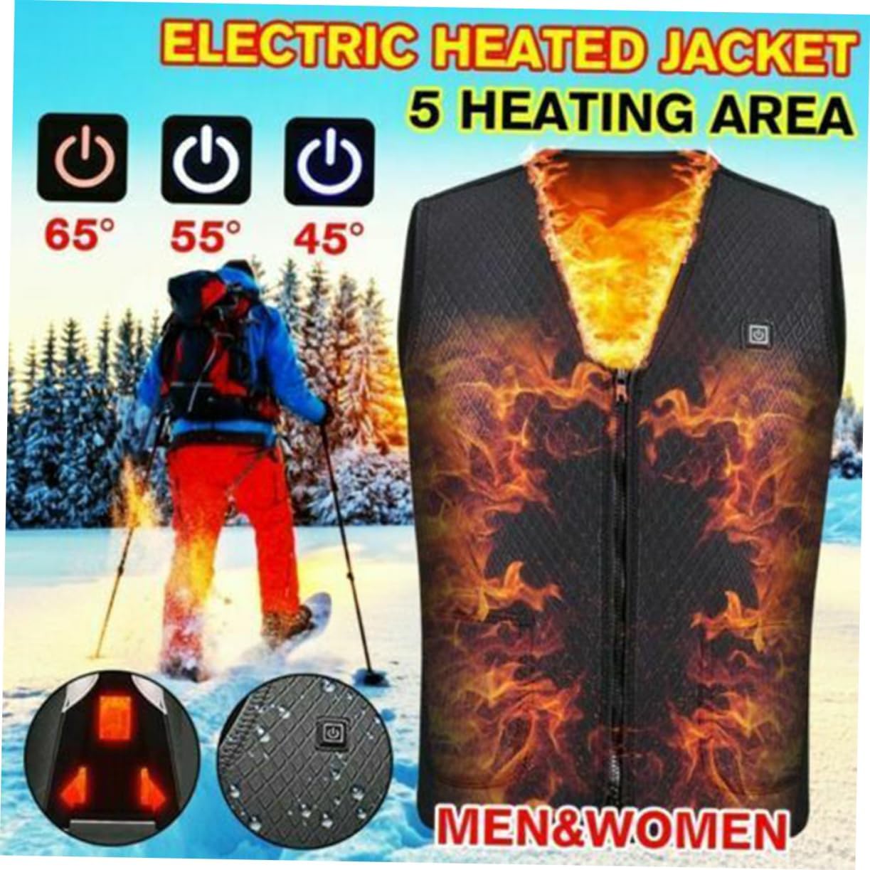 Package Include 1 x electronic heated vest Characteristics - Material: Polyster, spandex electric heated vest. 3XL: 185cm(height); 68cm(clothes length); 120cm(chest); 46cm(shoulder width); charging heated vest : 155-170cm(height); 58cm(clothes length); 96cm(chest); 38cm(shoulder width); unisex winter vest XL: 175cm(height); 63cm(clothes length); 108cm(chest); 42cm(shoulder width); warm jacket - Color: Black USB warm vest. 2XL: 180cm(height); 66cm(clothes length); 110cm(chest); 44cm(shoulder width); L: 165-180cm(height); 60cm(clothes length); 100cm(chest);40cm(shoulder width); - Note: This product does not have a mobile power supply and needs to be prepared. It can be machine washed, hand washed, do not wring dry by hand. - Size Table: - Waterproof electronic supports hand washing, and machine washing. - Three style temperature mode control. Up to 65°C. - The heated warm vest is for cold seasons, which is the choice and also works great as a standalone vest. - heated vest- 5V safety voltage. Built-in thermal module. - Operantion under USB charging, heated within 1 minute.Goods Informationheated vest heated vest- 5V safety voltage.charging heated vest Christmas parents and families.electric heated vest The unisex heated warm vest is for cold seasons, which is the choice and also works great as a standalone vest.electric gilet women Waterproof electronic supports hand washing, and machine washing.electric Three style temperature mode control